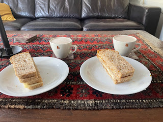 | Het ontbijtje van Willem en mij, vanmorgen op de bank. Het léék 10 minuten vakantie |